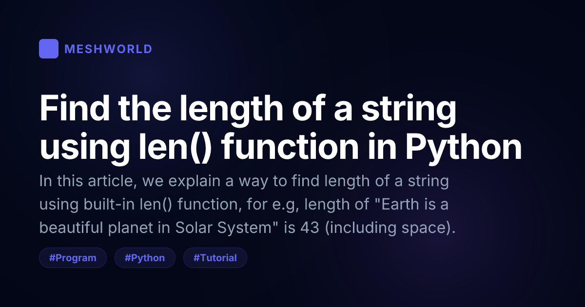 In this article, we explain a way to find length of a string using built-in len() function, for e.g, length of "Earth is a beautiful planet in Solar System" is 43 (including space).